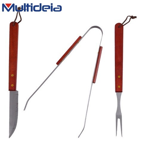 Kit Churrasco Carnes 3 Peças Faca, Garfo E Pegador De Aço Inoxidável