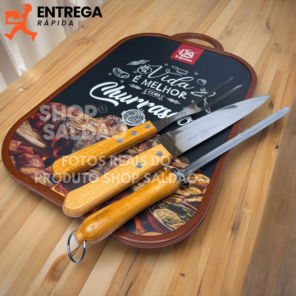 Kit Tabua de Carne Estampada Faca de Churrasco Chaira Amolador Garfo Trinchante Cabo Madeira ou Cabo Plástico Branco