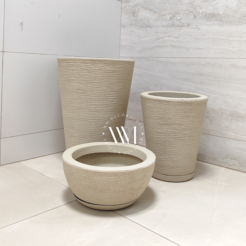 Kit 3 Vasos de Planta Flor Polietileno Texturizados Redondo Cone + Bojo + Bacia + Pratos