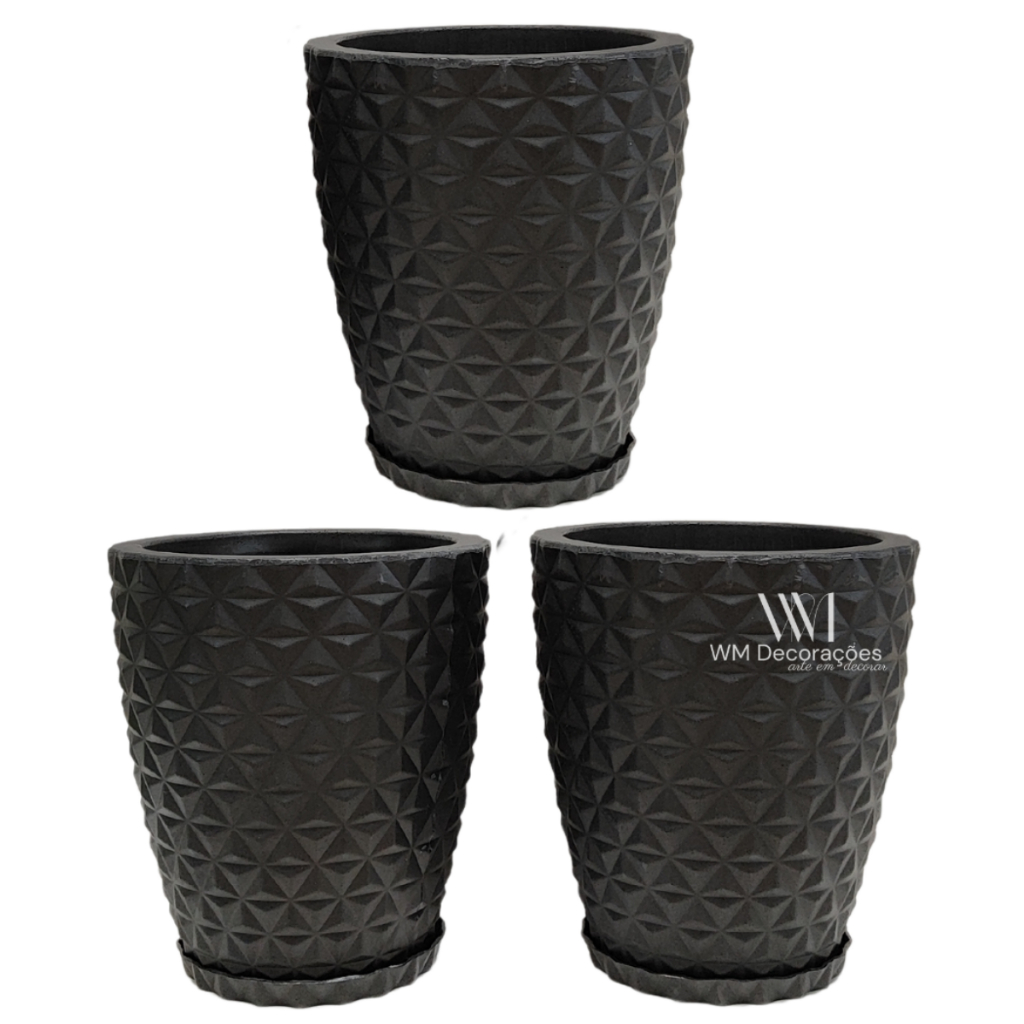 Kit 3 Vasos Texturizados Redondo Cone N1 (28x23) Para Planta Decorativo Polietileno Com Prato