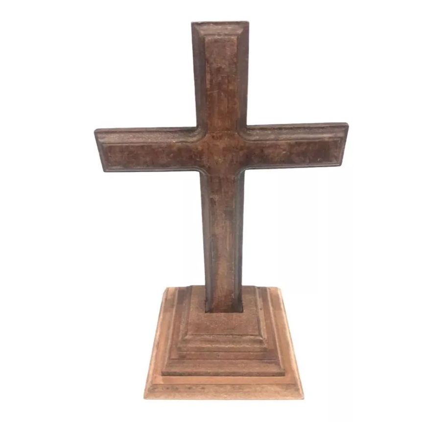 Cruz Crucifixo de Madeira com Cristo em Bronze no Tamanho de 33,5cm com Base de Mesa e Suporte pra Parede