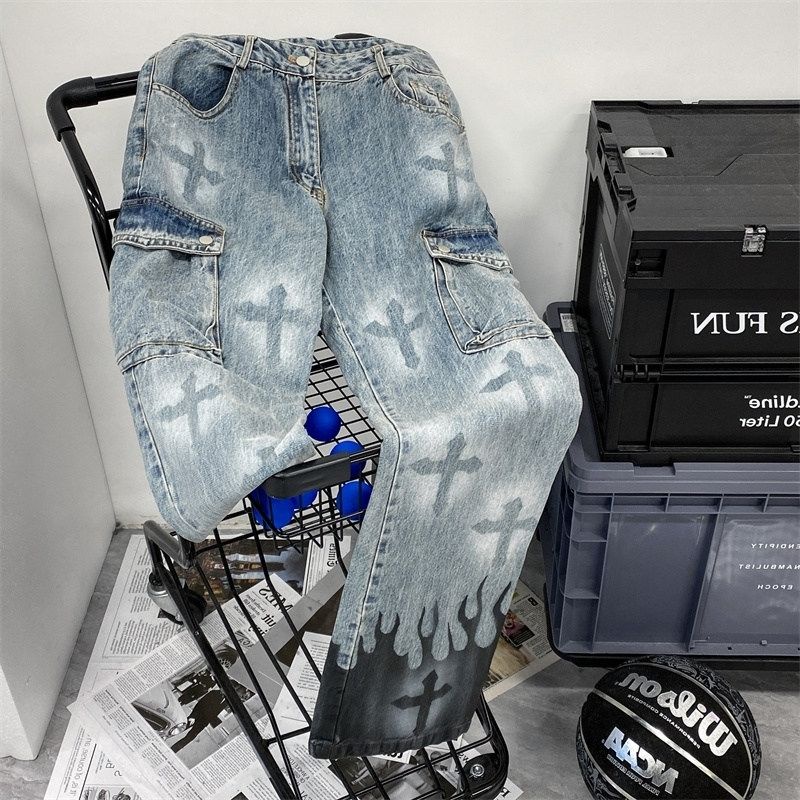 Marca De Moda De Rua Alta Calça jeans Lavada Em Cruz Para Homens E Mulheres Com Desenho De Mola Nichos De Mercado De Perna Larga Reta