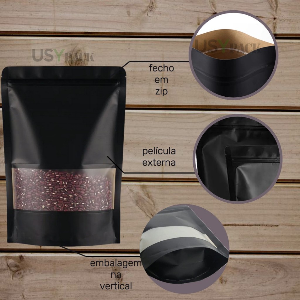 Saco de Papel Stand Up Pouch Kraft Branco C/ Plástico Hermético Impermeável C/ Visor (PCT C/ 50)