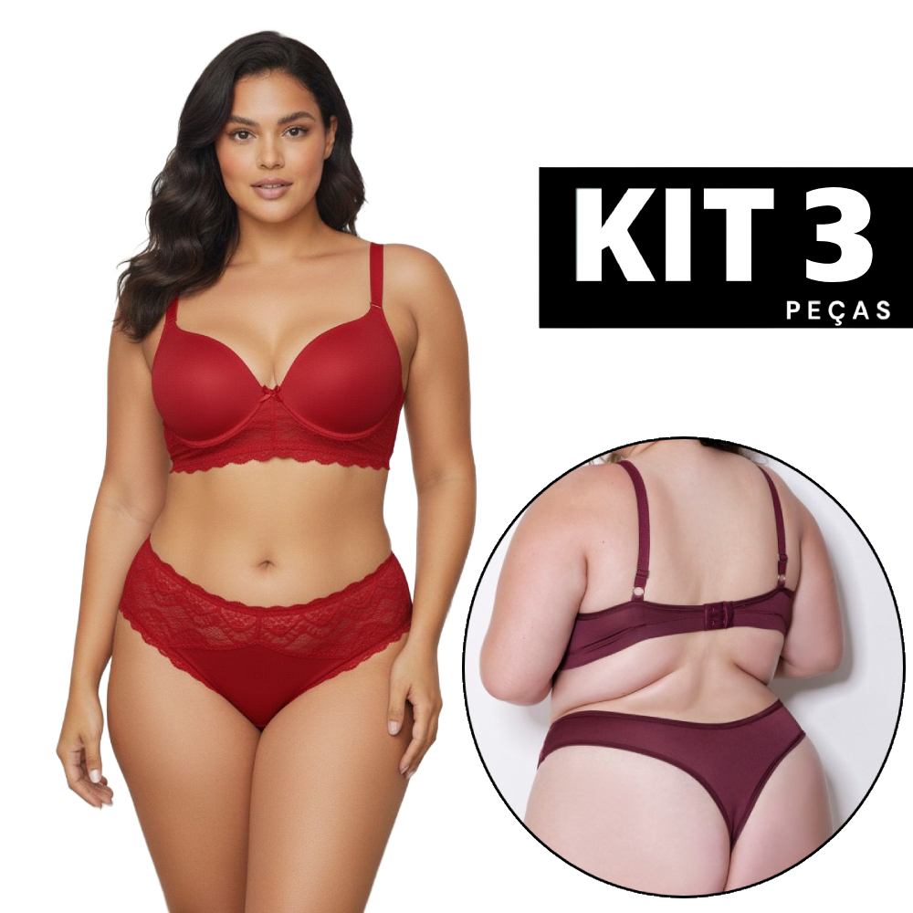 Kit 1 à 3 Conjunto Plus Size Sutiã Com Bojo e Calcinha com Detalhes em Renda Confortável