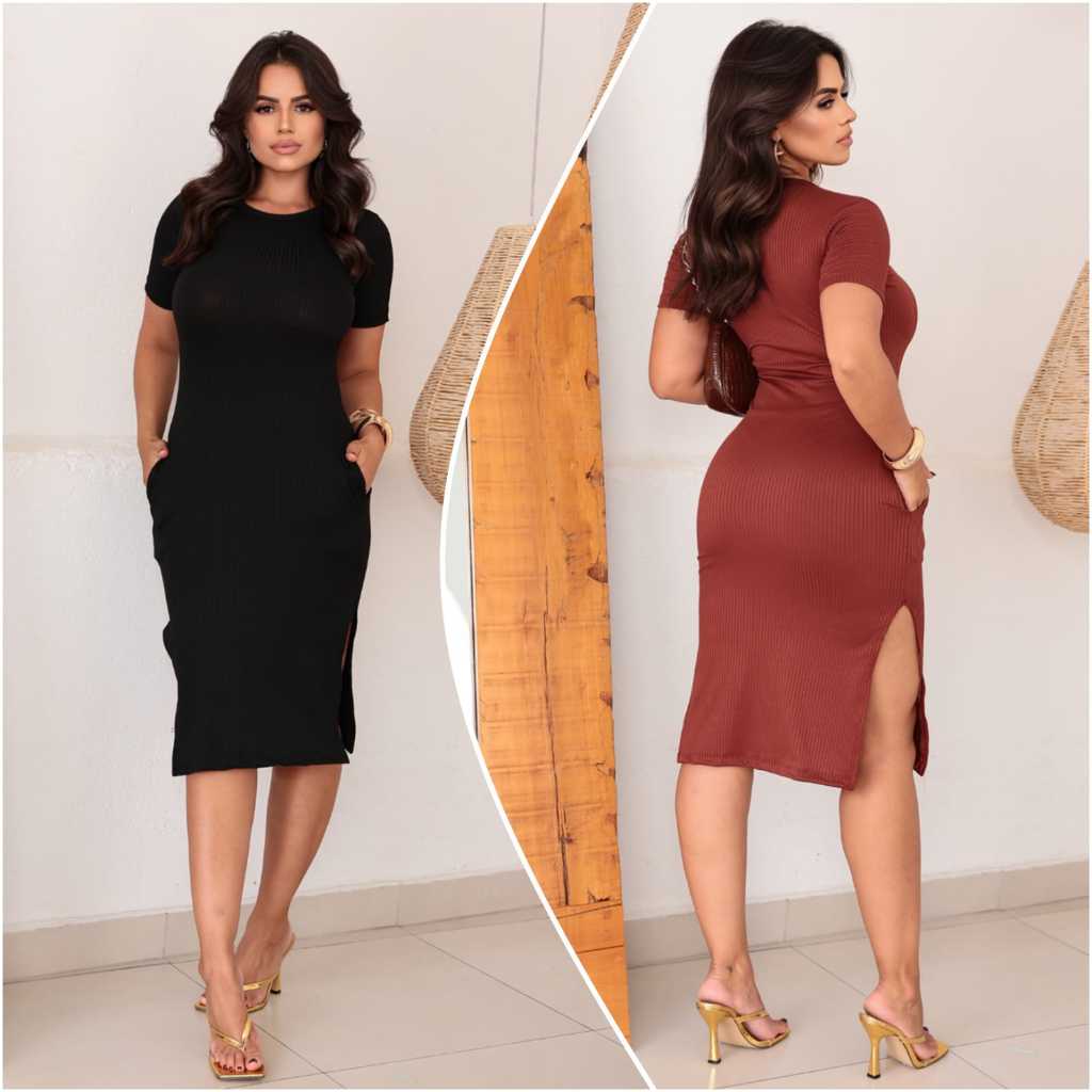 Vestido Midi Com Fenda e Bolso Manguinha Canelado Feminino Modinha Blogueira Tendência