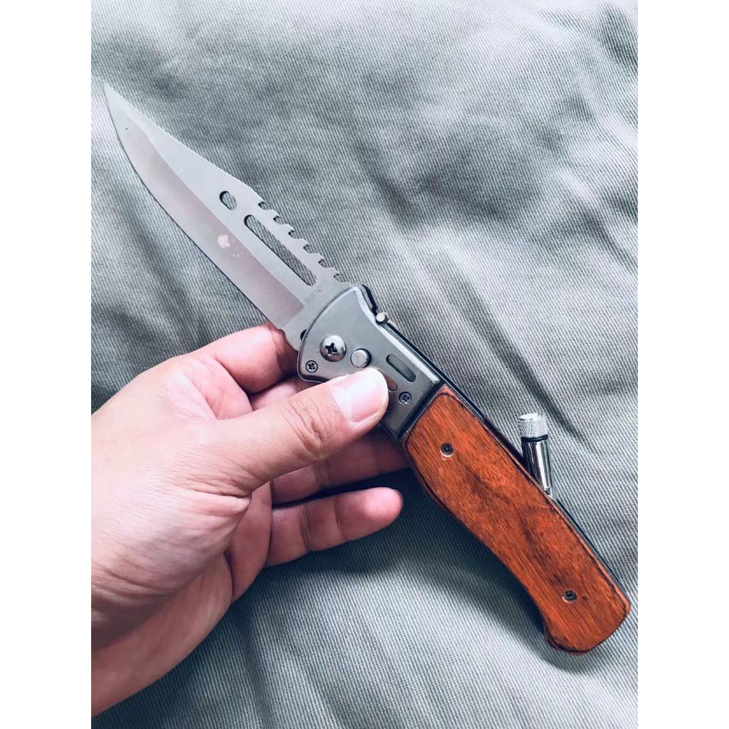 D11 Canivete Tático Militar Automático Saque Rápido Cabo de Madeira com lanterna 24cm Pesca Camping Trilha