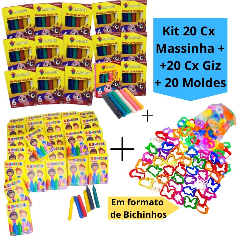 Kit 20 Cx Massinha de Modelar + 20 Cx Giz de Cera Mini + 20 Molde Cortador Forminha Lembrancinha Kit Festa