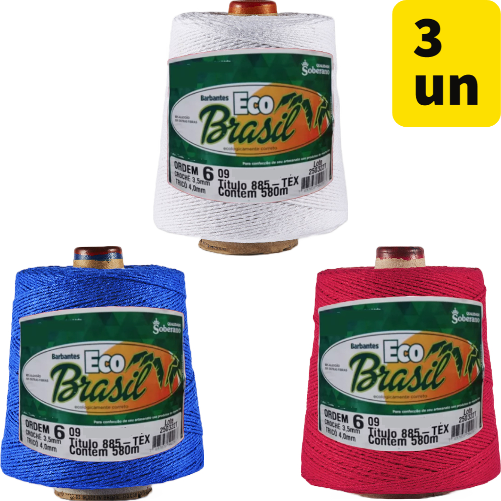 Kit 3 Barbantes Soberano Eco Brasil Colorido Ordem n° 6 de 700 Gramas 580 Metros para Crochê e Artesanato