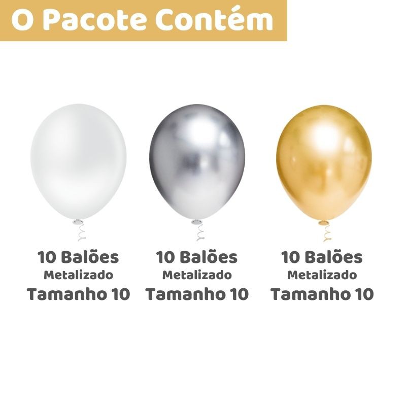 30 Balões Cor Dourado, Prata e Branco Metalizado - reveillon
