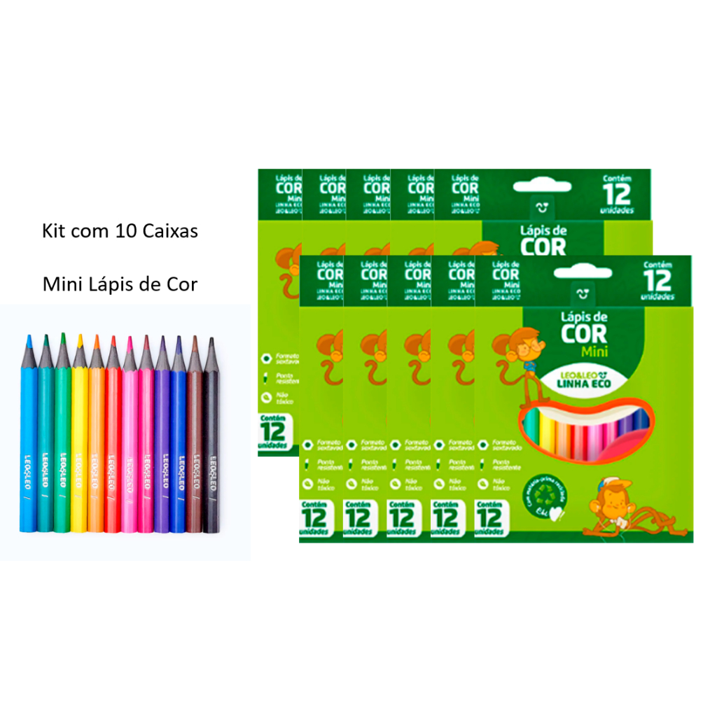 Kit 10 Caixas Lápis de Cor Mini 12 Cores Linha Eco Leo e Leo Material Escolar Lembrancinha
