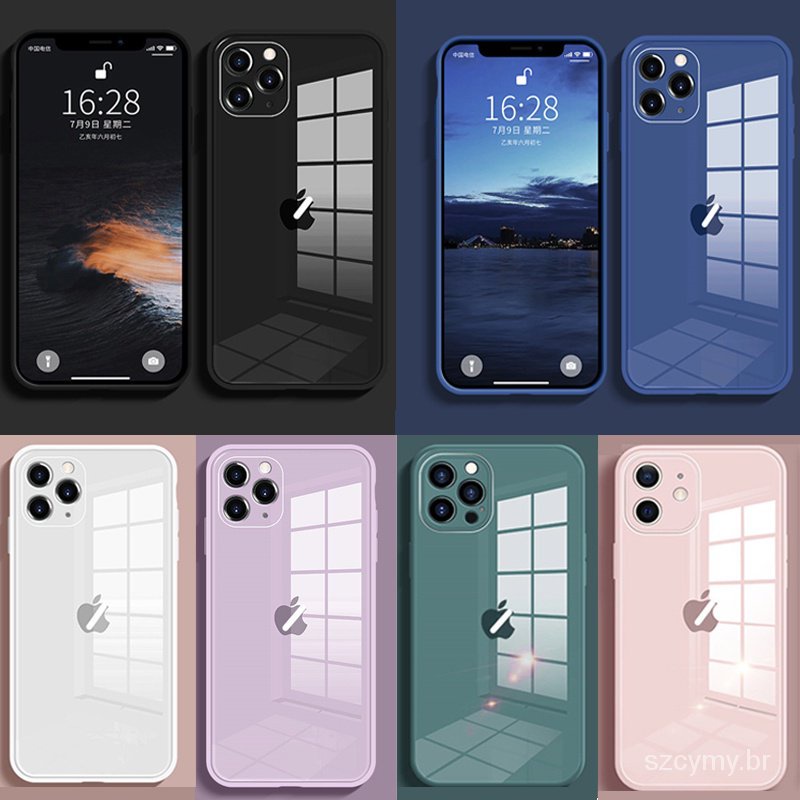 Capa de vidro Tempered Glass Phone Case for IPhone 11 12 Pro Max X XS XR 7 8 Plus Simple Solid Color Soft Edge Anti-drop Shockproof Cover