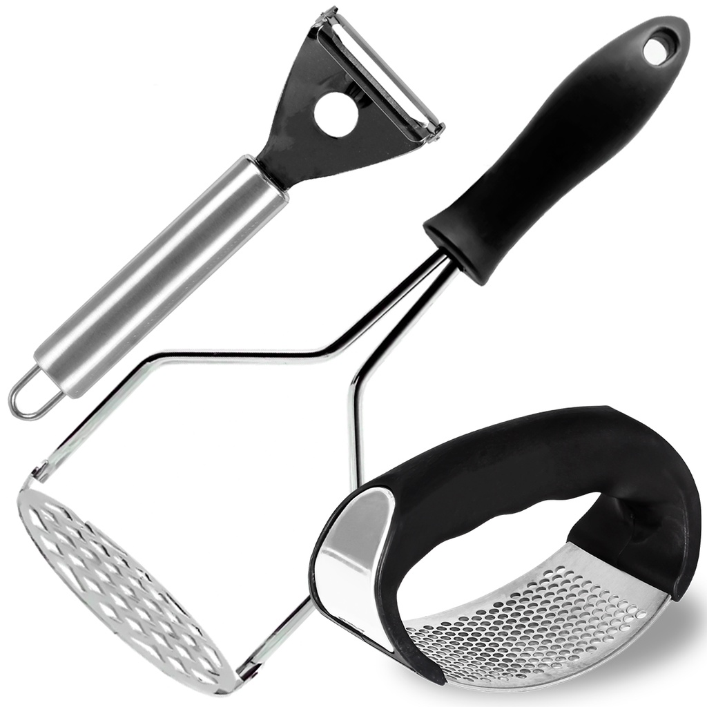 Conjunto Jogo de Amassador Espremedor de Alho Inox + Descascador de Alimentos Inox + Amassador de Batatas Inox Kit 3 Peças Utensílios de Cozinha Manual Fácil Multiuso Fruta Batata Legumes