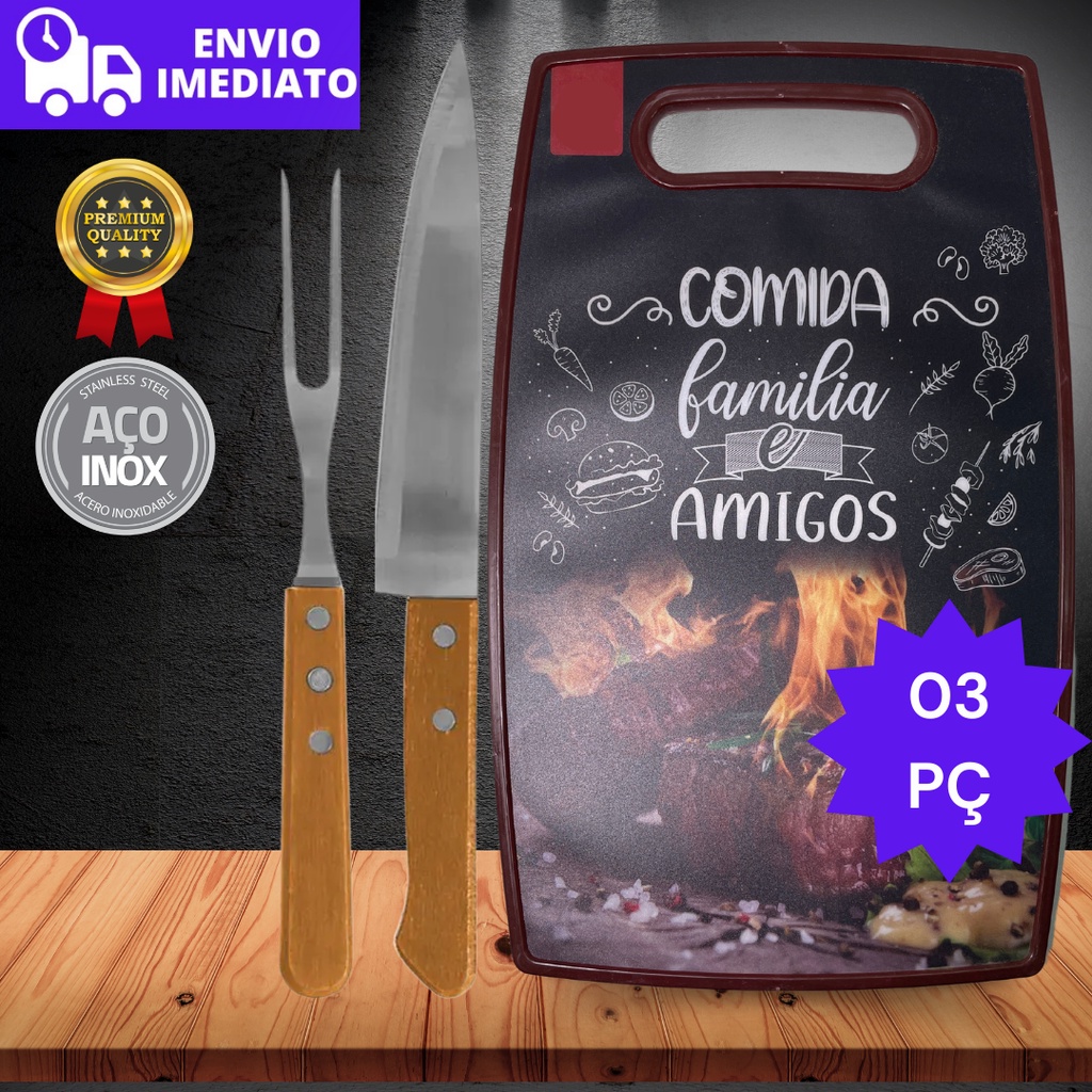 Conjunto Kit Churrasco 3 peças Tabua Faca Garfo Inox Cozinha Madeira