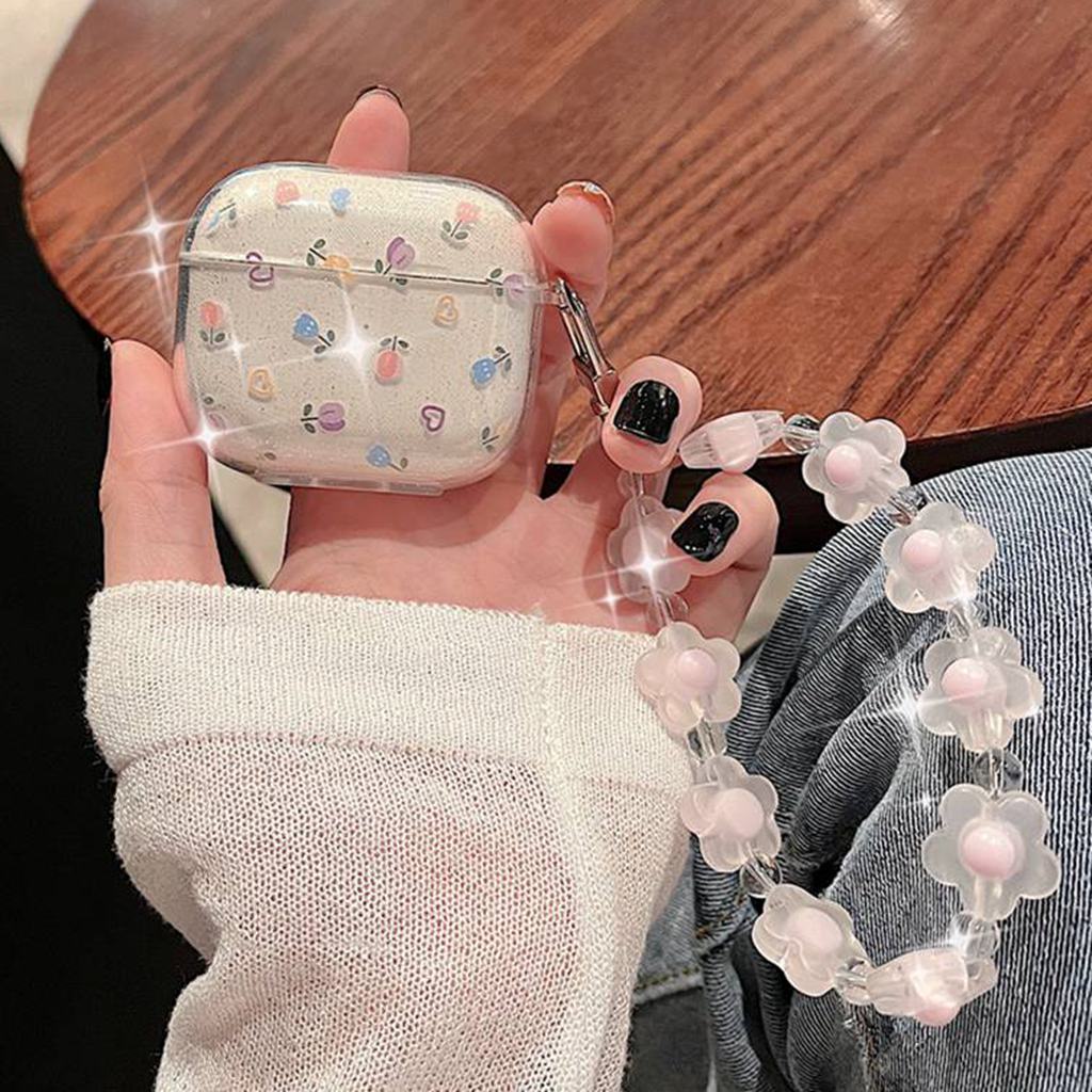 Caixa Para Airpods Pro 2 3 Ins Glitter Bling Floral TPU Flexível Transparente Bluetooth Capa De Fone De Ouvido Com Corrente De Contas De Cristal Pulseira Sem Fio Manga Protetora