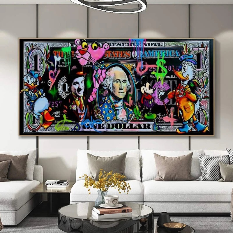 Quadro decorativo 1 peça 90x70 pantera rosa Mickey mouse pato donald grafite no dólar dinheiro colorido abstrato moderno decoração para casa sala quarto hall