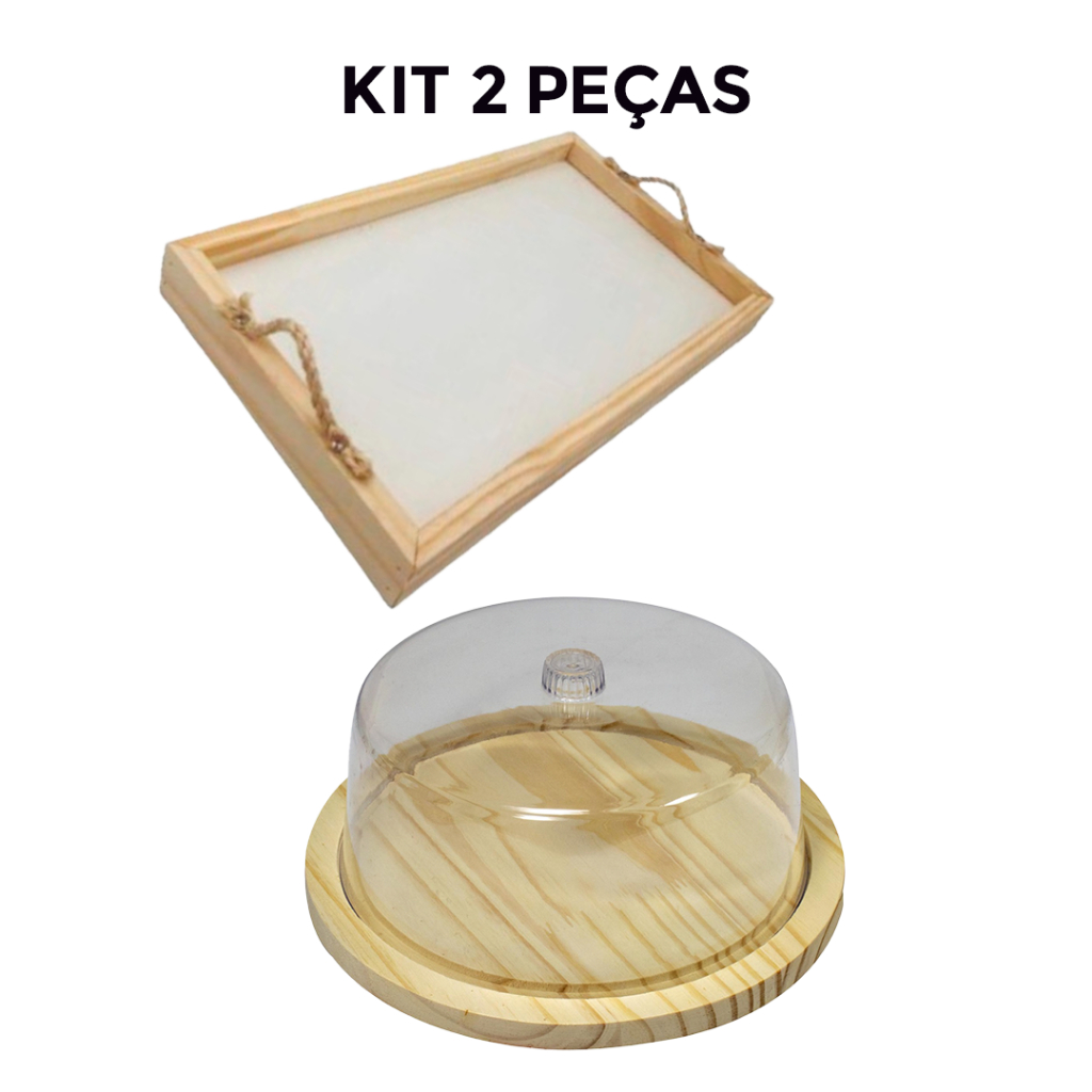 LANÇAMENTO Kit 2Pçs (Bandeja com alças e Boleira de Madeira Natural) Cozinha, Mesa, Café, Bolos