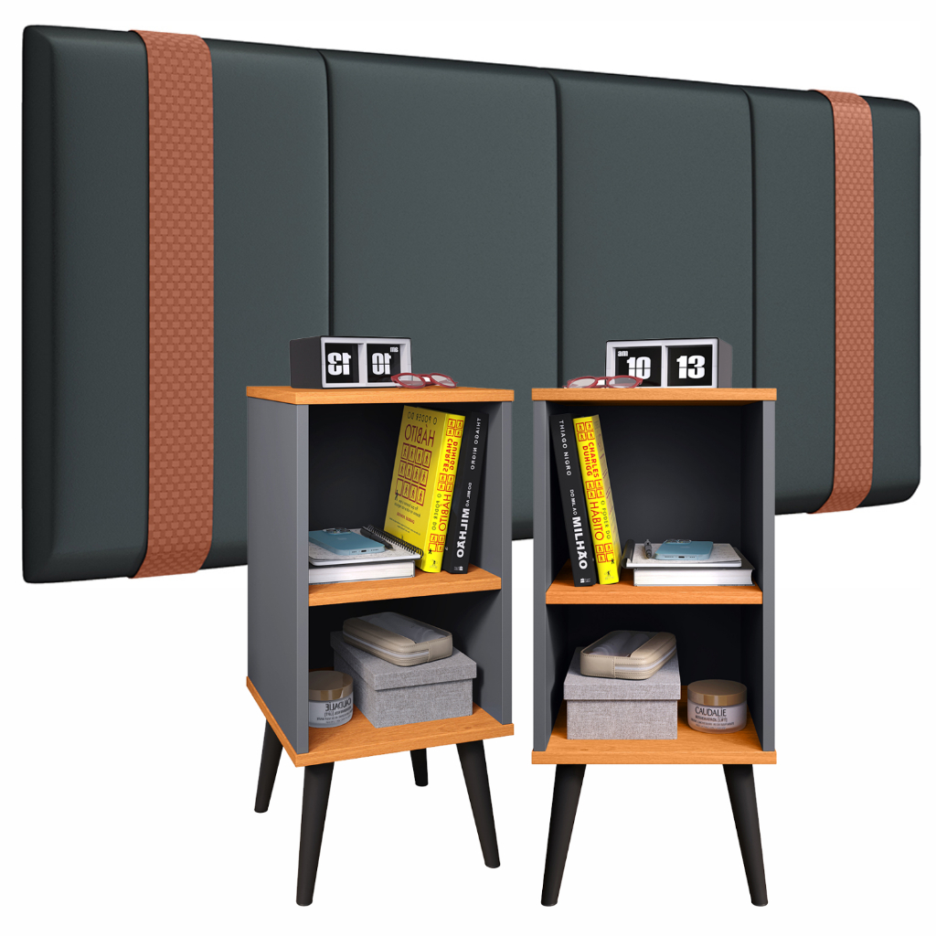 Lançamento Kit Cabeceira + 2 Criado - Mudo Mesinha Quarto Casal Retrô Mesa de Cabeceira Cor Cinza