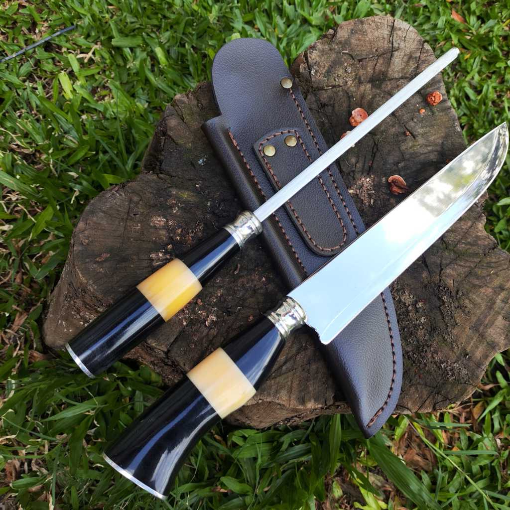 "Kit Faca e Chaira Inox 8'' com Bainha de Couro Sintético – Cabo Resina e Osso para Churrasco Artesanal"