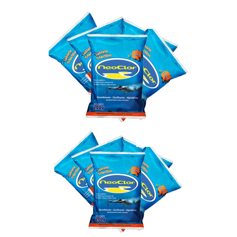 KIT 10 PASTILHAS DE CLORO CLARIFICANTE TABLETES 200G PARA PISCINAS 3 EM 1 NEOCLOR