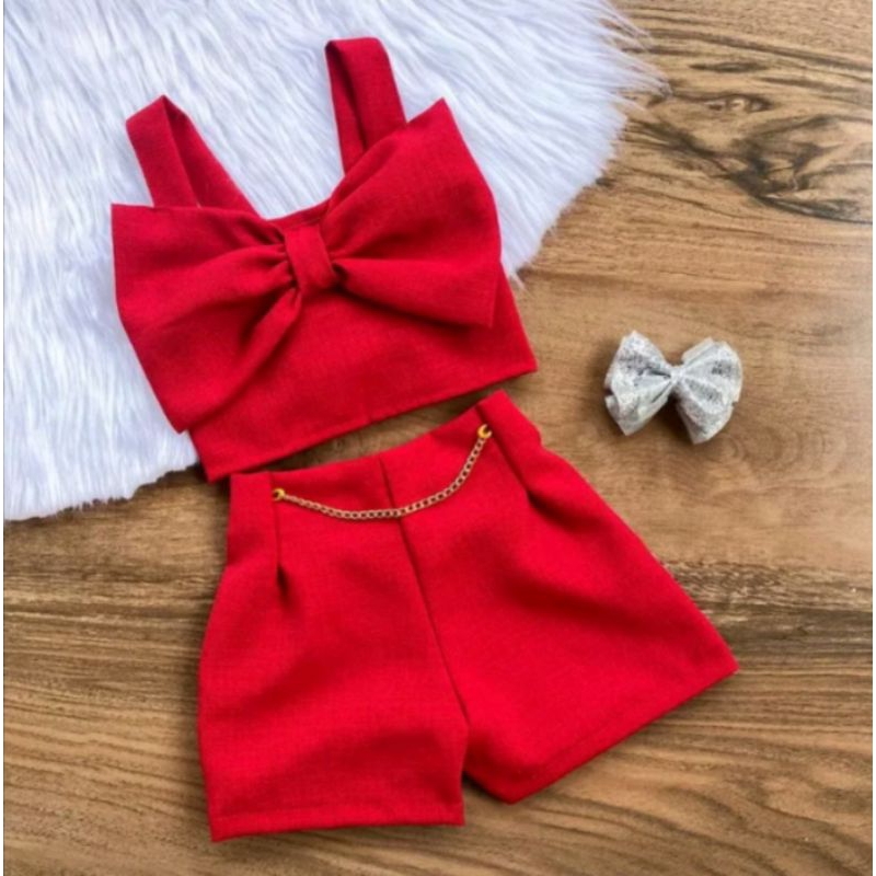 Conjunto infantil meninas Linho shorts e blusa cropped laço conjunto infantil mini diva alfaiataria