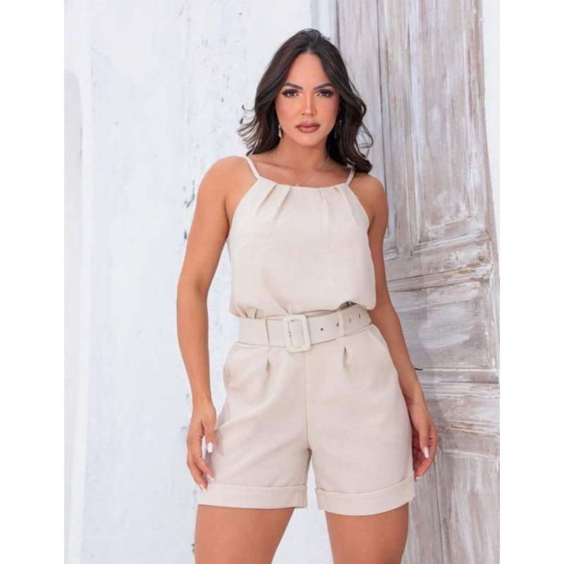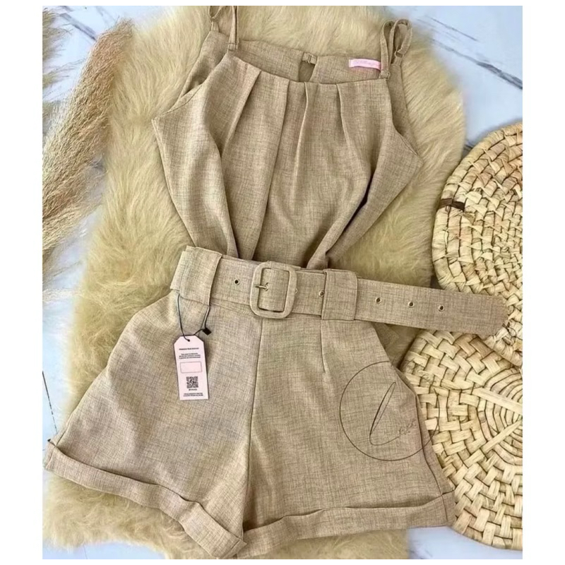 Conjunto De Linho,Blusa Alça Shorts Com Cinto E Bolso