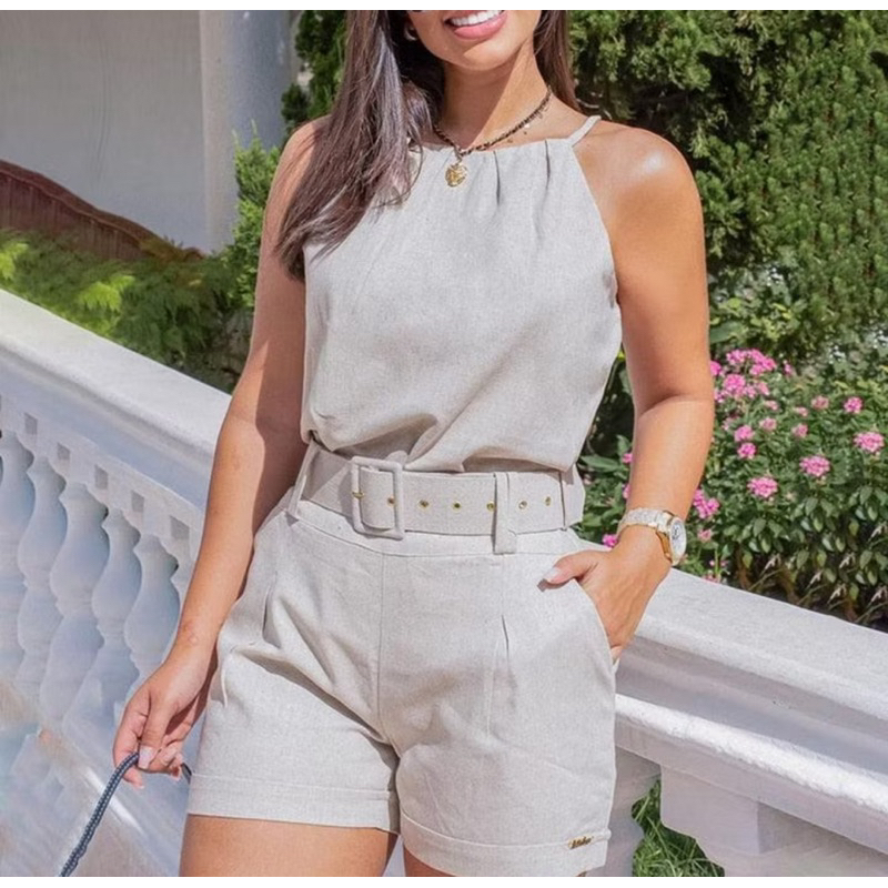 Conjunto Feminino Tecido Linho Com Cinto Forrado Linhão Blusinha e Short