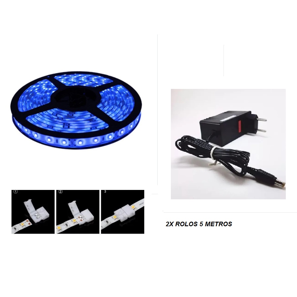 10 Metros Fita Led 3528 IP65 Azul + Fonte Bivolt Sanca Gesso Decoração