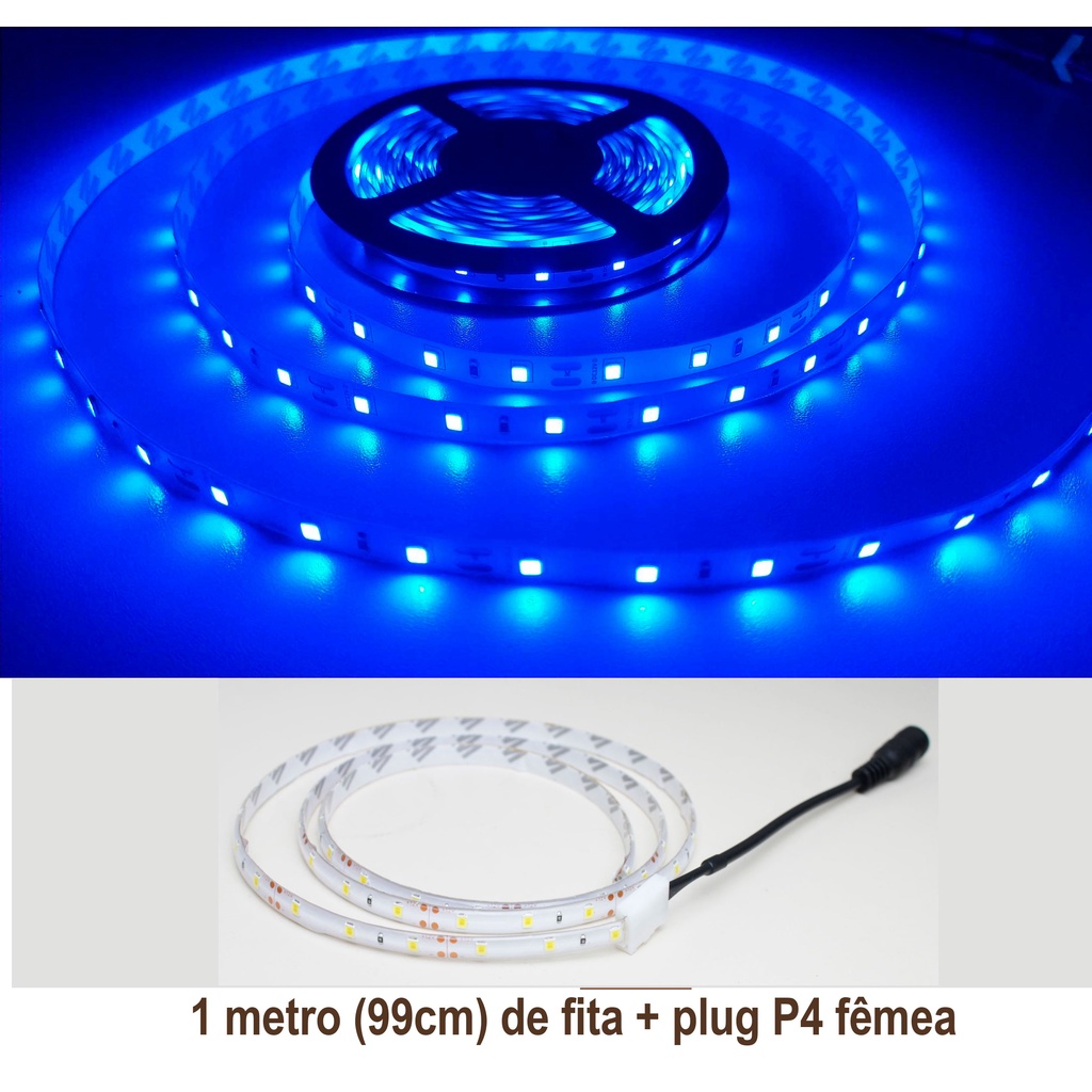 Fita LED Azul 1 metro (99cm de fita) 3528 IP65 Siliconada 12V Dupla Face com Plug Femea P4