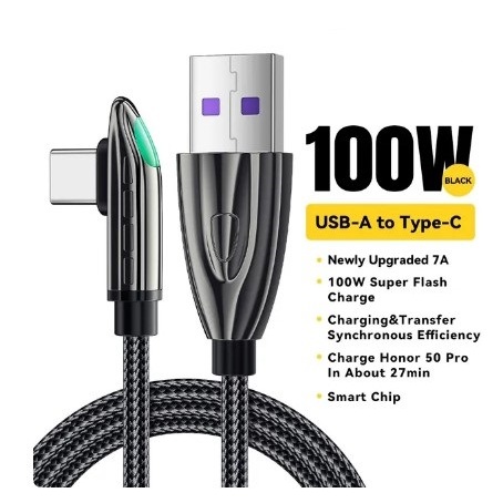 Cabo Essager 100W 7A USB p/tipo C, C/ conector 90º, LED 5A, 1m, carregamento rápido