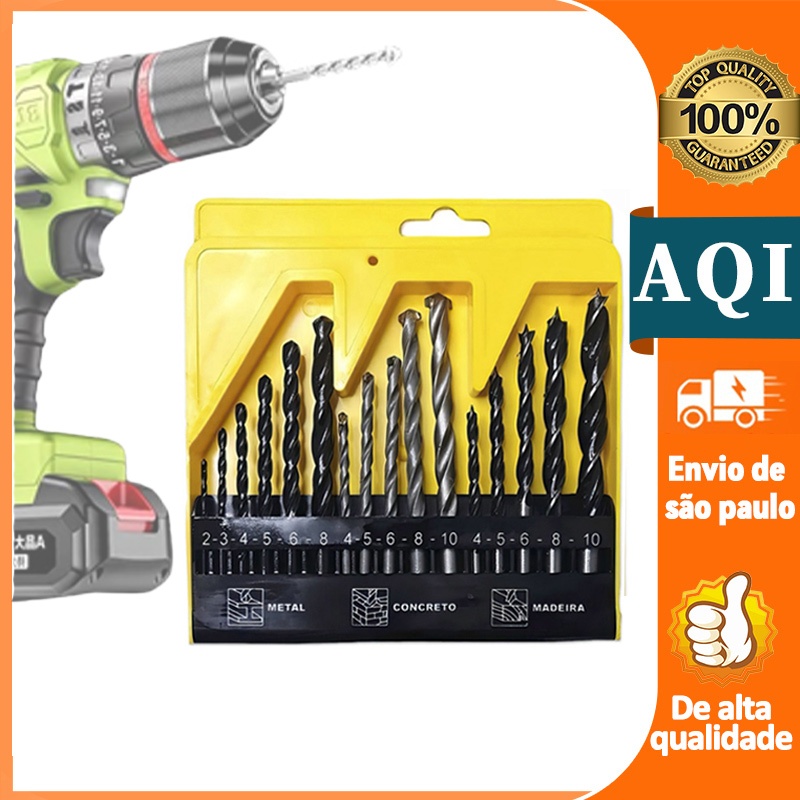 Jogo De Brocas Kit 16 Peças C/ Estojo P/Madeira Ferro Concreto Metal Aço Para Furadeira Parafusadeira