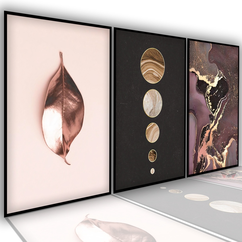 Kit 3 Peças Quadros Decorativos de Parede Mosaico Nordic Flor Dourada Luxo Pintura Folhas Ouro Sala Quarto