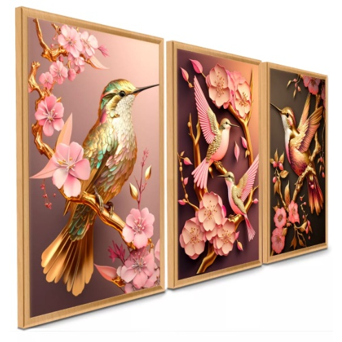 Quadros De Beija Flor Flores De Cerejeira Dourado Rosa Sala