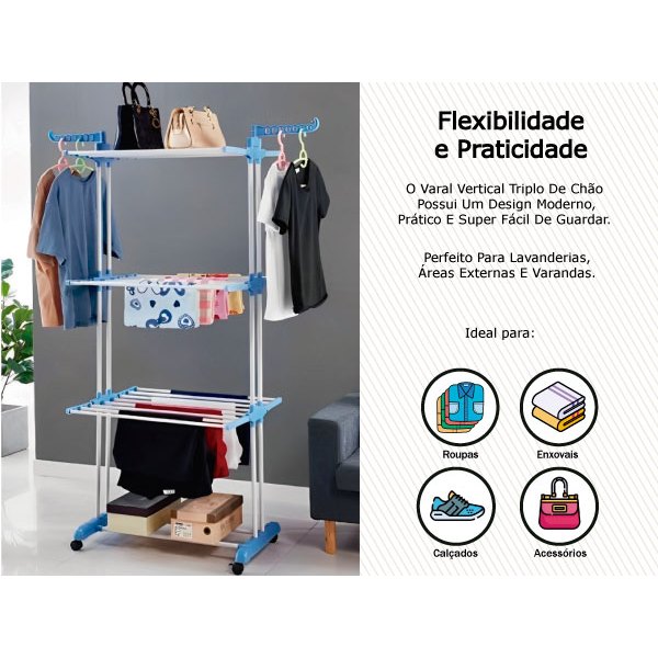 Varal de Chão 3 Andares Grande Dobravel Compacto com 4 Rodas Envio Rapido
