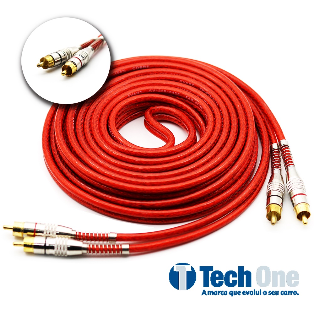 Cabo RCA 5 Metros Dupla Blindagem 5m Blindado Vermelho 5mm Plug Metal Som Automotivo Conectores Duplos Banhado a Ouro Proteção Contra Ruídos Caixa Bob Paredão