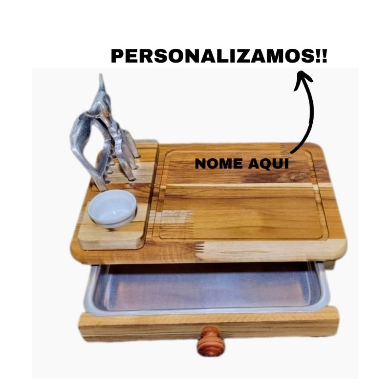 KIT TABUA DE CARNE GAVETA PERSONALIZADA, COM GARRA TRIDENTE E CUMBUCA PARA MOLHOS