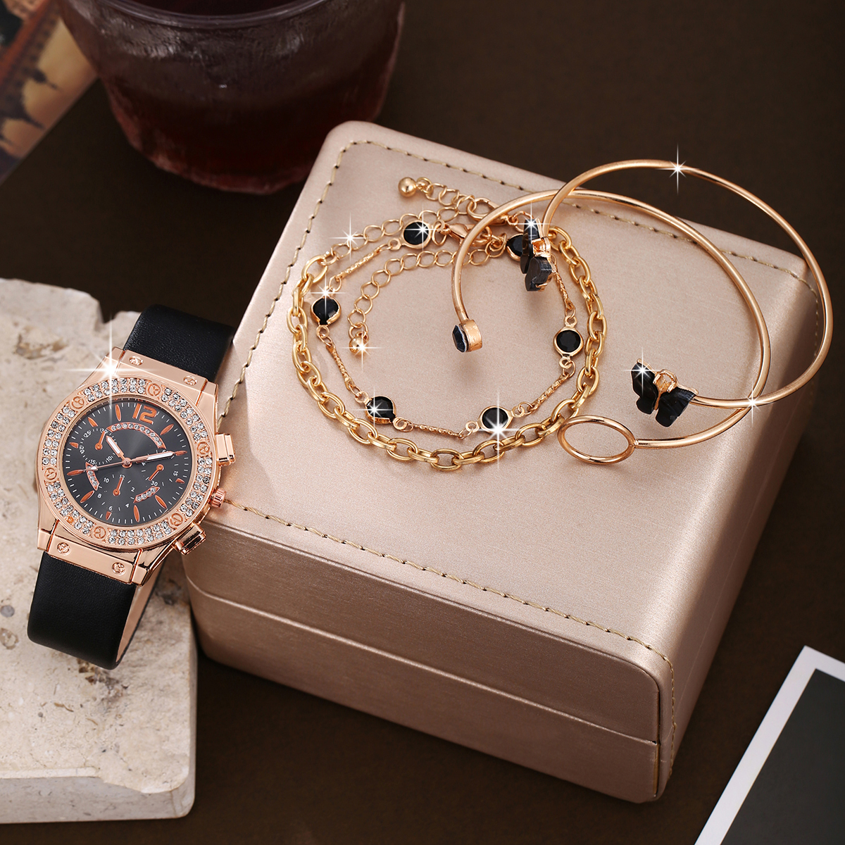 Um Relógio Clássico de pulso feminino de luxo leve e de pulso feminino Relógio Diamond-Set Inglês +Rose Gold Bracelet Set