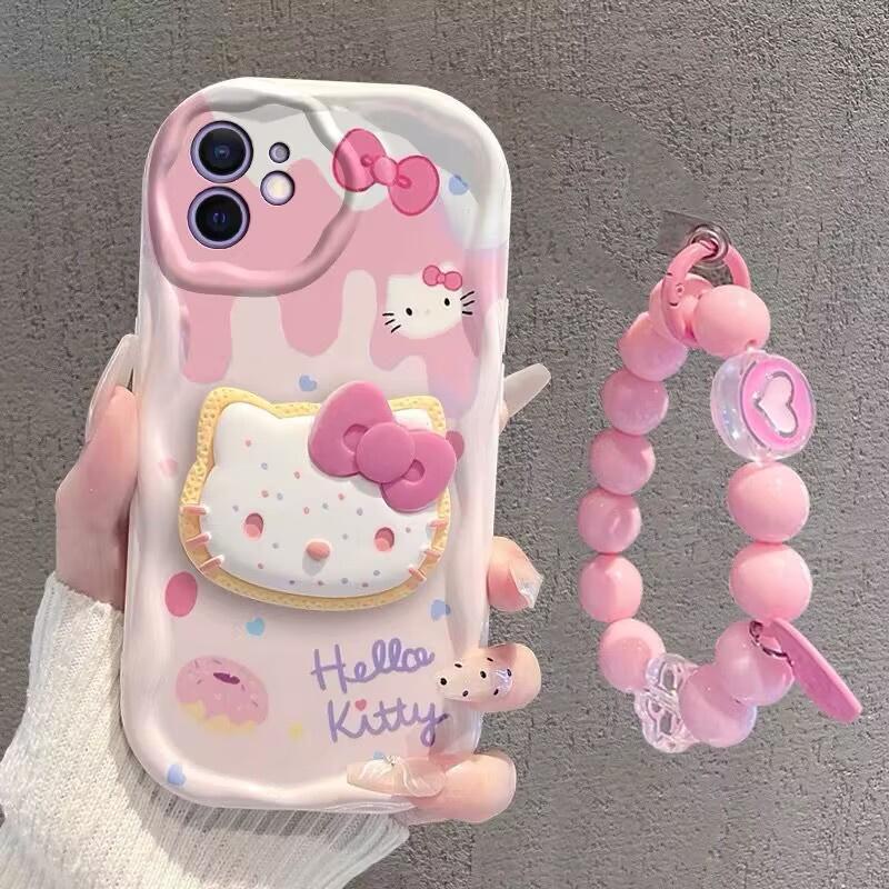 Fofo Hello Kitty Suporte De Pulseira De Gato Pérola Corrente Cartoon Soft Phone Case Para Samsung Galaxy A14 A13 4G 5G A21S A22 A05 A05S A04S A04 A04E A02 A02S A03 Capa De Borda Ondulada