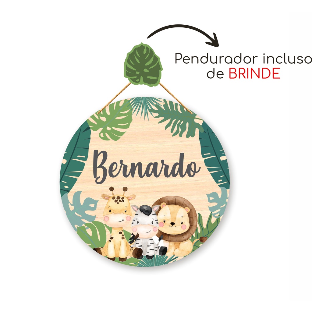 Enfeite Porta Maternidade Safari Bichinhos Nome Personalizado Placa Flâmula Redonda + Pendurador Incluso