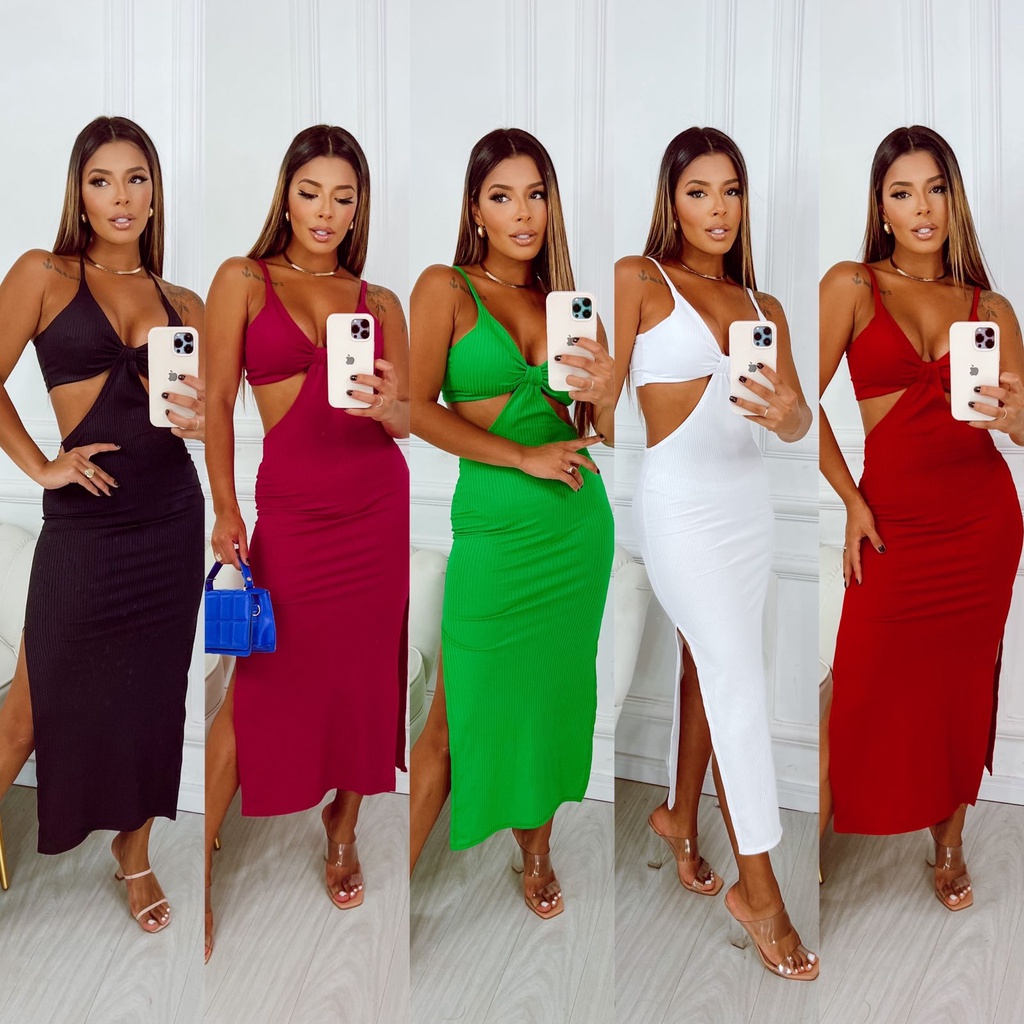 Vestido Midi Feminino Canelado De Alça Bojo Detalhe Na Barriga Fenda Na Perna Verão