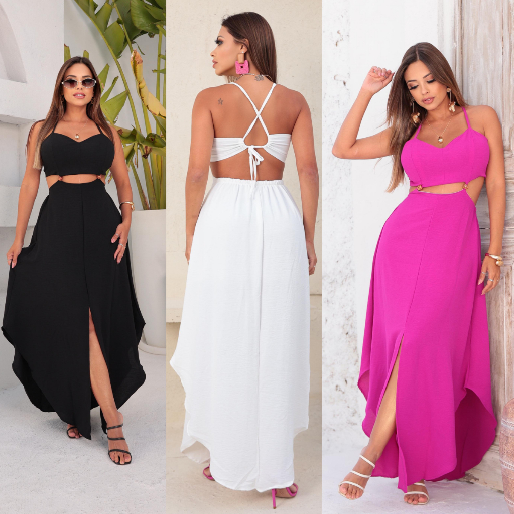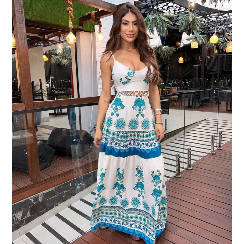 Vestido Longo Feminino Alça Detalhes em Viés Verão Tendência