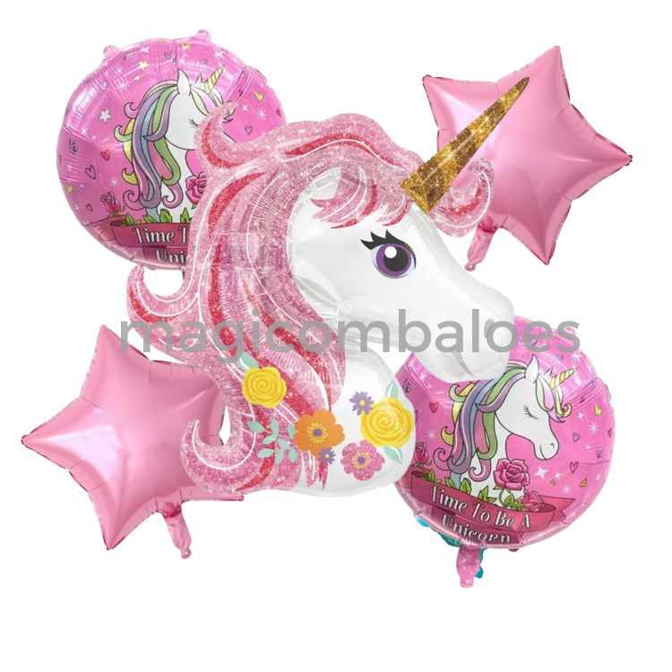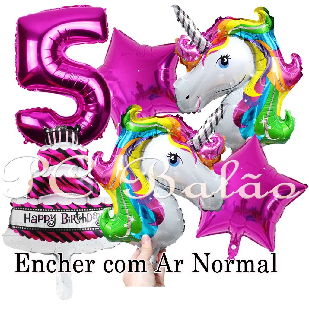 Kit 5 Balão Metalizado 1 Unicórnio 120cm + 2 Balão Redondo +2 Estrela 45cm Menina Decoração Festa N2