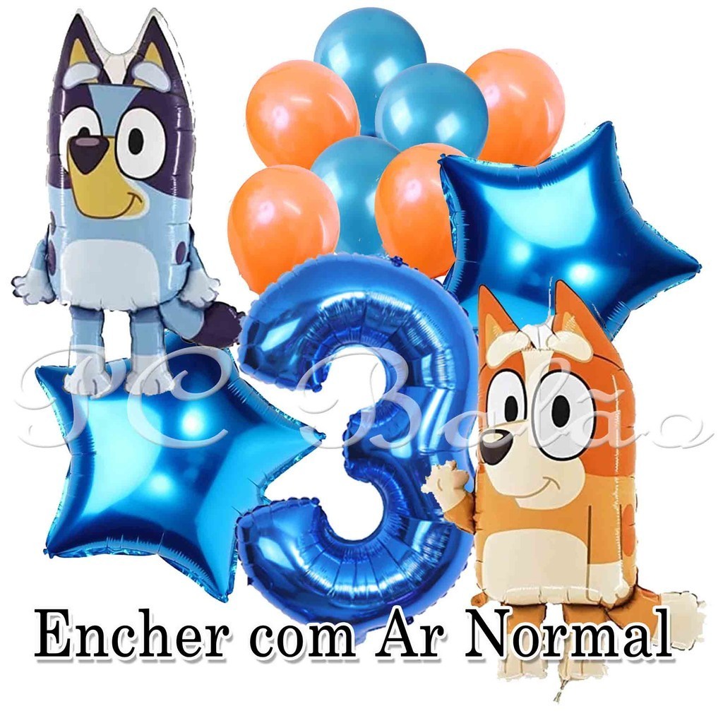Kit 12 Balão Metalizado 2 BLUEY E BINGO + Bexiga 4 LARANJA 3 AZUL + N° 70cm AZUL + 2 Estrela AZUL