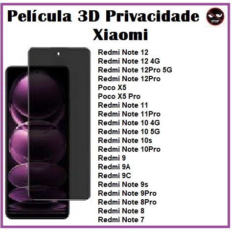 Película 3D Vidro Xiaomi Privacidade Anti Spy Redmi Note 7/8/9s/9 pro/10/9A/9C/9T/11/Poco M3/F3/X3/Mi 8 lite
