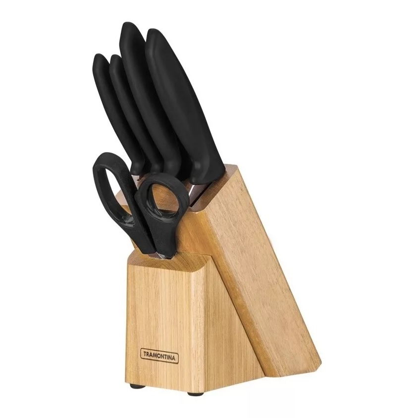 Jogo de Facas Tramontina Plenus com Lâminas em Aço Inox Cabos de Polipropileno Preto e Suporte de Madeira 6 Peças