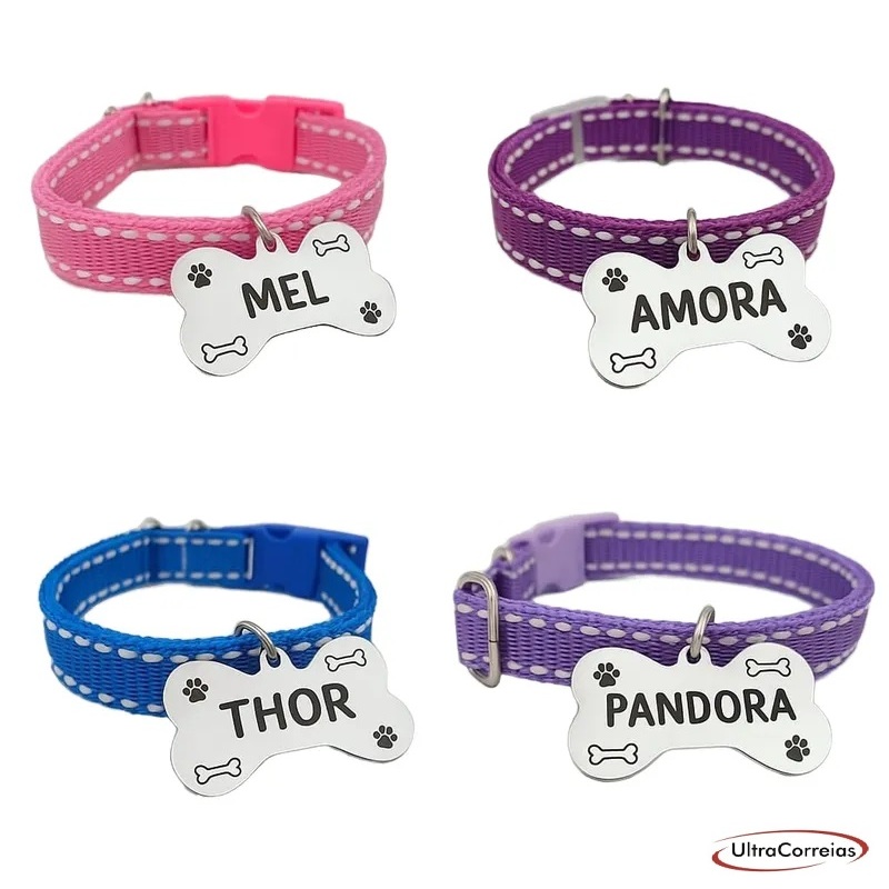 Coleira Identificação Pet Personalizada com Nome + Plaquinha de Osso com Nome e Número