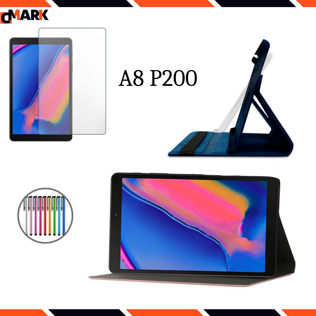 Kit 3 em 1 - Capinha Giratória Compatível com Samsung Galaxy A P200 / P205 de 8 Polegadas + Película De Vidro 9H + Caneta Touch - Capa Case 360º