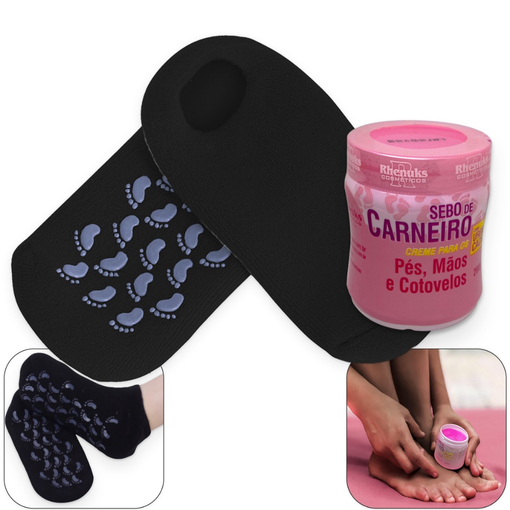 Meias Femininas Antiderrapantes com Silicone Interno + Creme Gel Loção Sebo de Carneiro para Hidratação de Pés, Mãos e Cotovelos Ressecados Hidratantes Spa para Ressecamento Rachadura Tratamento Spa