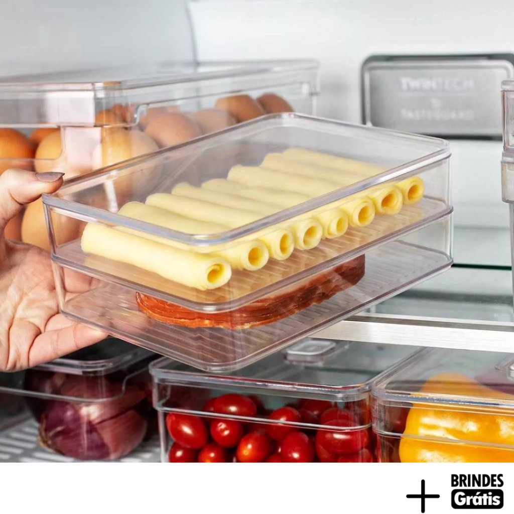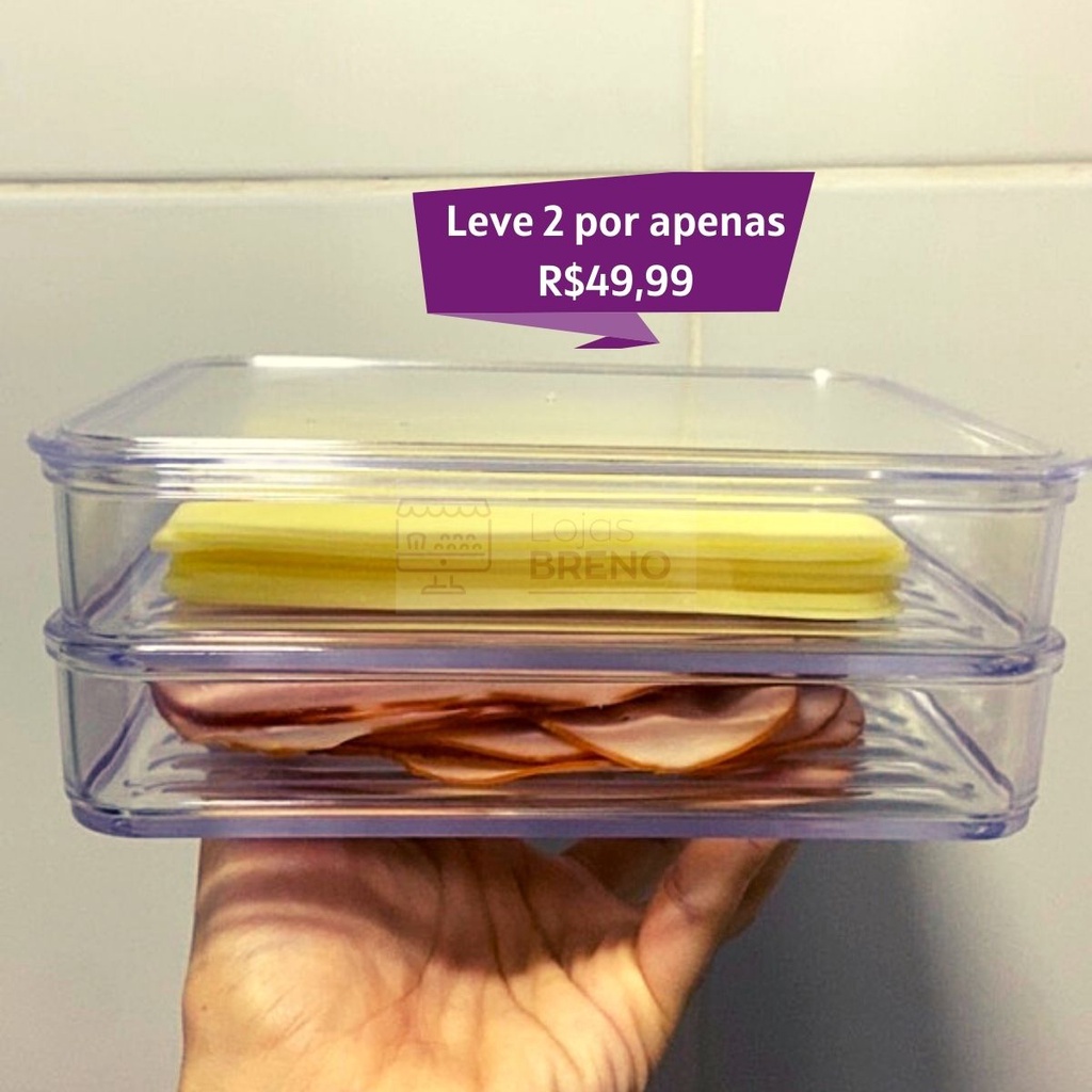 Kit Jogo 2 Porta Frios queijeira Hermetico 1000ml Retangular Acrilico Com Tampa - Empilhável