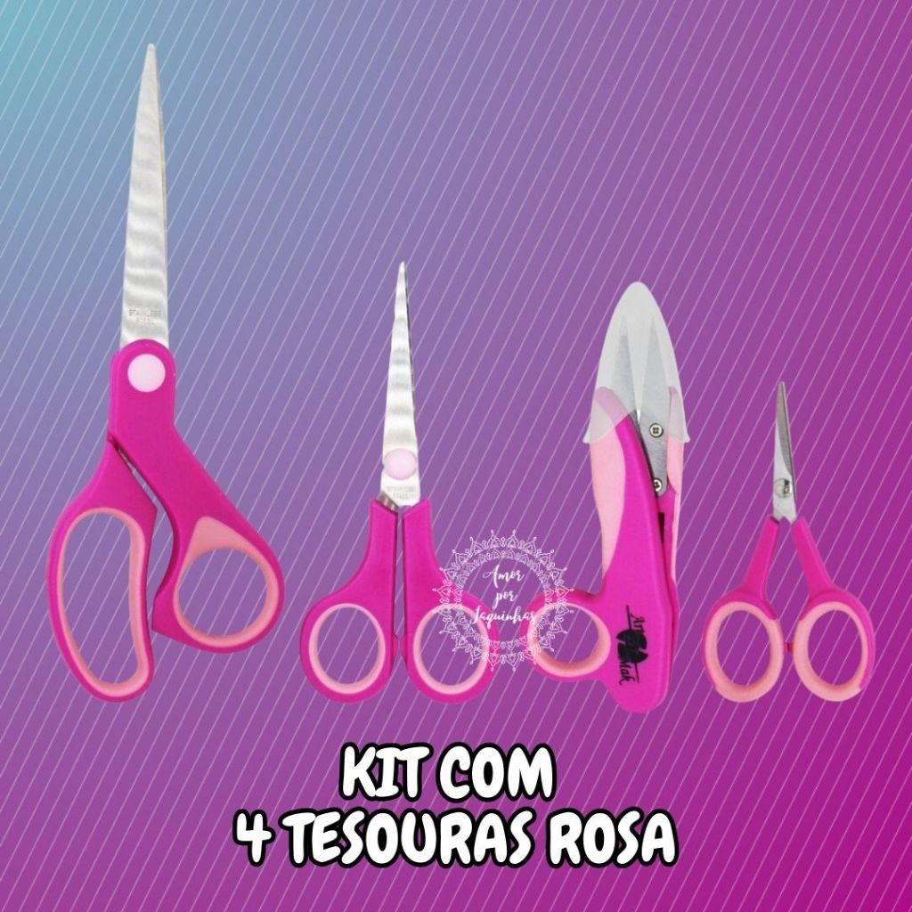Kit com 4 Tesouras Rosa Multiuso Profissional Artesanato Patchwork Costura Scrapbook