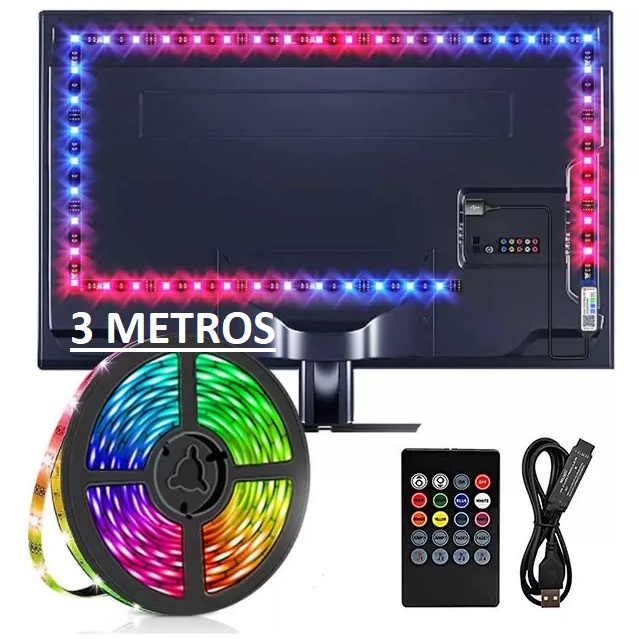 Fita Led 5050 Rgb Colorida Usb 3 Metros Sensor Ritmico Com Controle Batida da Música Fundo Tv Pc Quarto Gamer